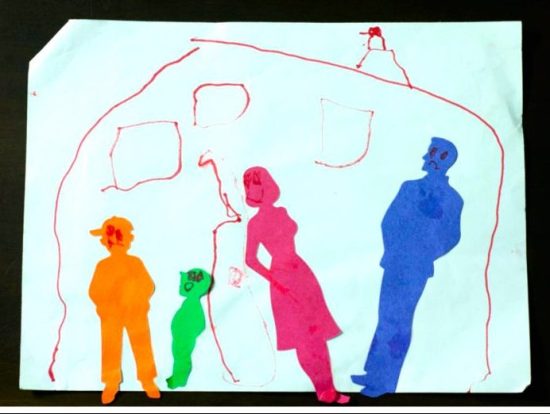 Seemingly, there is artistic disparity among the objects. Each family member appears to be copied while the house is rudimentary. A curious presentation of a family and home.