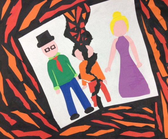 This talented artist presents her perception of parental divorce. The fragmentation of the child adds to the drama of how divorce impacts the child. Facial features are mostly absent. Dad and child seem to be touching hands and mom looks like she is reaching out. The contrast of white against the background adds to the overall impact of the artwork.