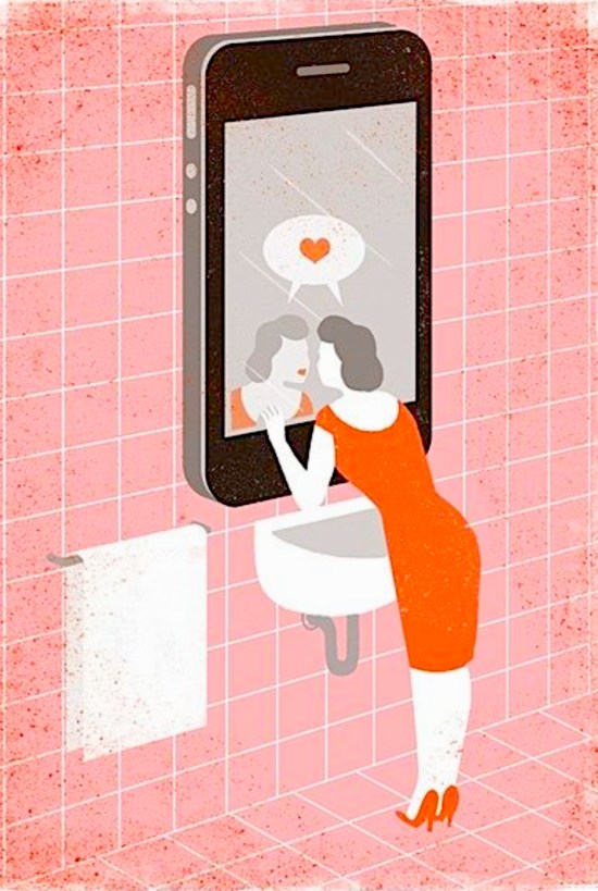 A quintessential representation of an individual with narcissistic tendencies. This seems to capture the idea of the selfie and gazing into the looking glass to view herself! Text bubble indicates there is no division between the individual and her adoring reflection. They both look beautiful. Seemingly, a child would become lost in the shuffle and would require attention on someone other than both of ‘her-selves’. As long as the focus remains on her-all is right with the world.