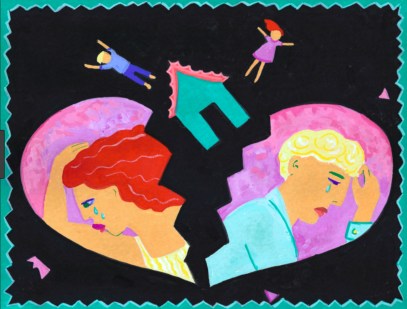 This is a colorful presentation of divorce. The black backdrop adds to the drama and emotional impact. A split heart with two parents who both seem distraught with tears. Two children are floating as if being tossed from the small house in between them. This artwork is used to show a child how divorce may feel. Sadly, the ridges on each side of the heart, and both children without a strong attachment to anything are realistic.