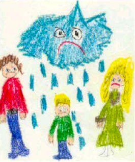 A very sad depiction of parental divorce. Everyone has a sad face. Even the prominent blue tear at the top seems lost and forlorn. This young artist presents a sense of being alone as he is surrounded by large blue tears. Hopefully, someone will reach out to this child.