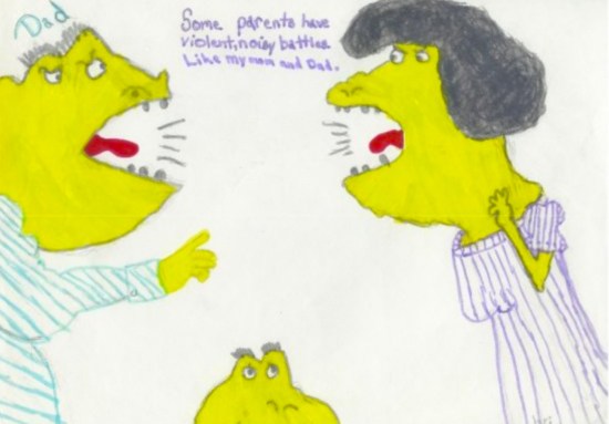 A startling portrayal of divorce for this young one. A small part of the child is visible. Does this mean the child feels overlooked? The wide eyes indicate this child knows what is happening. Both parents seem enthralled in this fight. The prominent red tongues support the caption ‘violent, noisy battle’. How long will this go on before someone notices their little one is watching them?