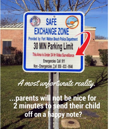 This is a most unfortunate reality for some parents in a high conflict divorce. A drop zone created by the city to accommodate parents who will not be nice during the exchange. Security cameras are watching the area for any outbursts or abnormal behavior. Notably, there are many parents even missing out on this!