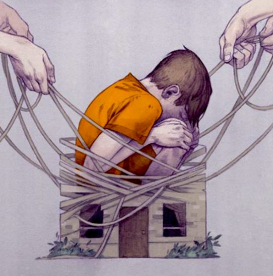 An emotionally captivating expression of divorce. This child seems stuck in the middle in what was once his home. Two individuals/parents(?)are unraveling the home life of this child. This boy appears terribly distraught; crouched and hiding his face. Do these parents have any idea what they are doing to their child? A a most bewildering depiction of divorce.