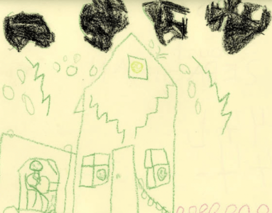 Large rain drops are coming down and all around the home. Dark clouds are looming above with bolts of lightening. Notably, each window has a happy face peering out. A happy person is sitting in the house to the side. Is this the artist? Or, a parent? A curious drawing with stormy weather and happy faces.