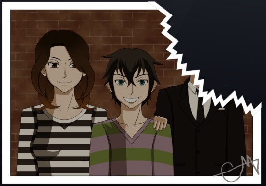 A talented artist portrays a childhood friend in a picture with both of their parents. One parent is missing from this artwork. The child in the in the middle is smiling. Which parent is hugging this child? The jagged edges where the father is positioned emphasizes the absence.