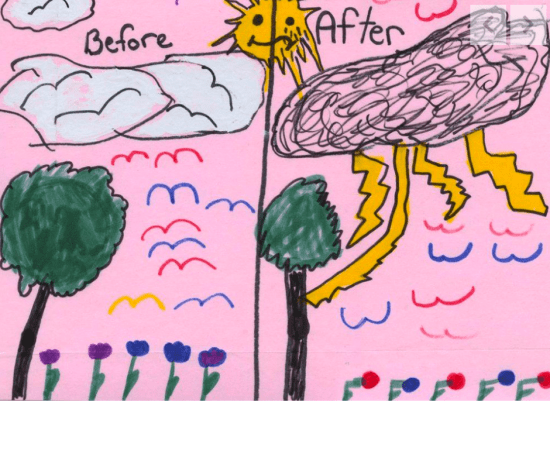 Art is a way for children to express their feelings and thoughts. This artwork demonstrates a difference in how they perceive their word. Notice how the white and fluffy clouds turn to black scribbles with very jagged bolts of lightening. The sun is sad with tears and the flowers are wilted. Even the tree is smaller and filled with less color. This child appears to be experiencing changes in her world. I hope the parents or teacher reach out to this child. Divorce is between the parents and about the child.