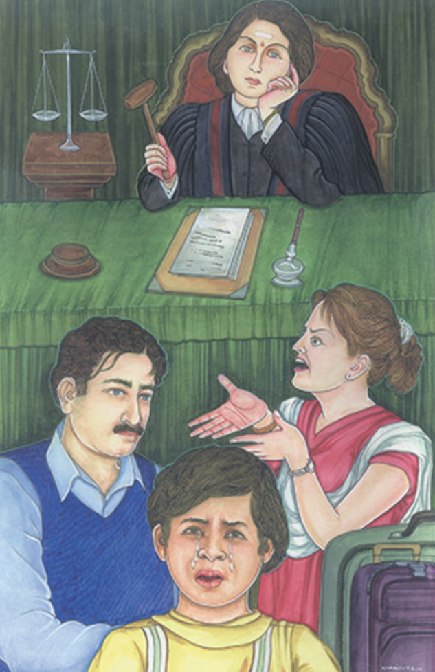 A powerful picture! Scales are in view. Is this a fair case? Are the red hands indicative of something? Two parents and a child are at the desk. Suitcases packed; does this mean someone is moving out? Mom and dad are fighting. The child is in the middle of his parents with large tears streaming down his face. What is this child experiencing?