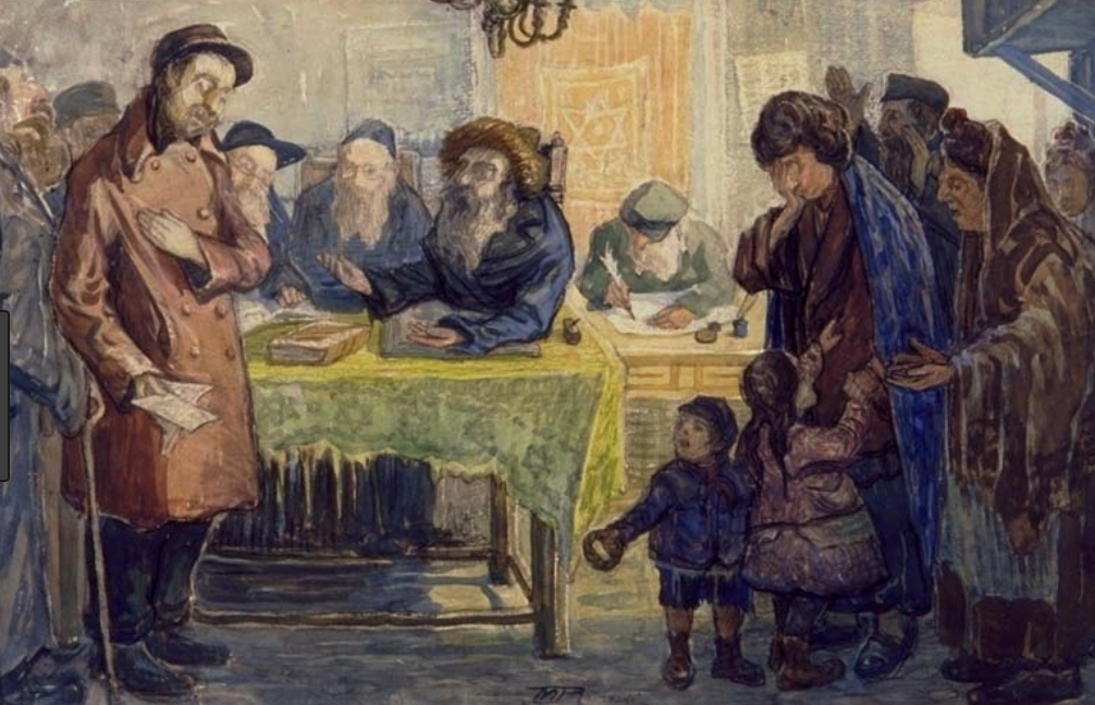 A scribe in the center indicates this is a different time period. Is this father holding the papers making the separation legal? Or, why are his children being separated from him? Closed eyes and hand on his heart show the separation may not be his idea. One child is looking to their father. Children being separated from a parent is a devastating event regardless of the time period.