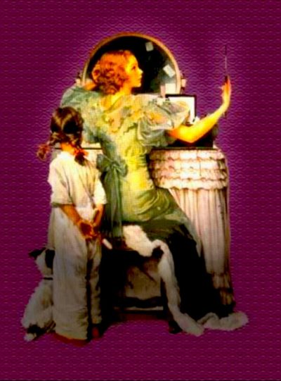 A beautiful child looking on adoringly and this mother is totally captivated with herself. A mirror in front and a mirror to the side. In this picture the mother is dressed in a bright color and the light shines upon her. Everything else in the picture is less colorful and pronounced. I hope this little girl has someone in her life who makes her feel special.