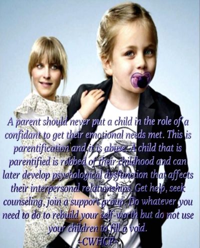 A parentified child of divorce sacrifices their needs to care for the parent and the parent gives up their role to one or more of their children. A parentified child expresses ‘concern’ for the parent while the healthy emotional bond is absent. In essence, the child is not allowed to be a child. This dynamic has long-term negative consequences for the child and will be realized in interpersonal and intrapersonal relationships throughout the life of the child.