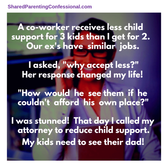 Sometimes, hearing how someone else handles their divorce becomes a moment of clarity and inspire us to do things differently. Two co-workers talking about their custody matters turned into a life-altering moment for one mom. The insight resulted in changing everything- for everyone. As one mother discovers, accommodating the financial situation of one parent can make things easier.